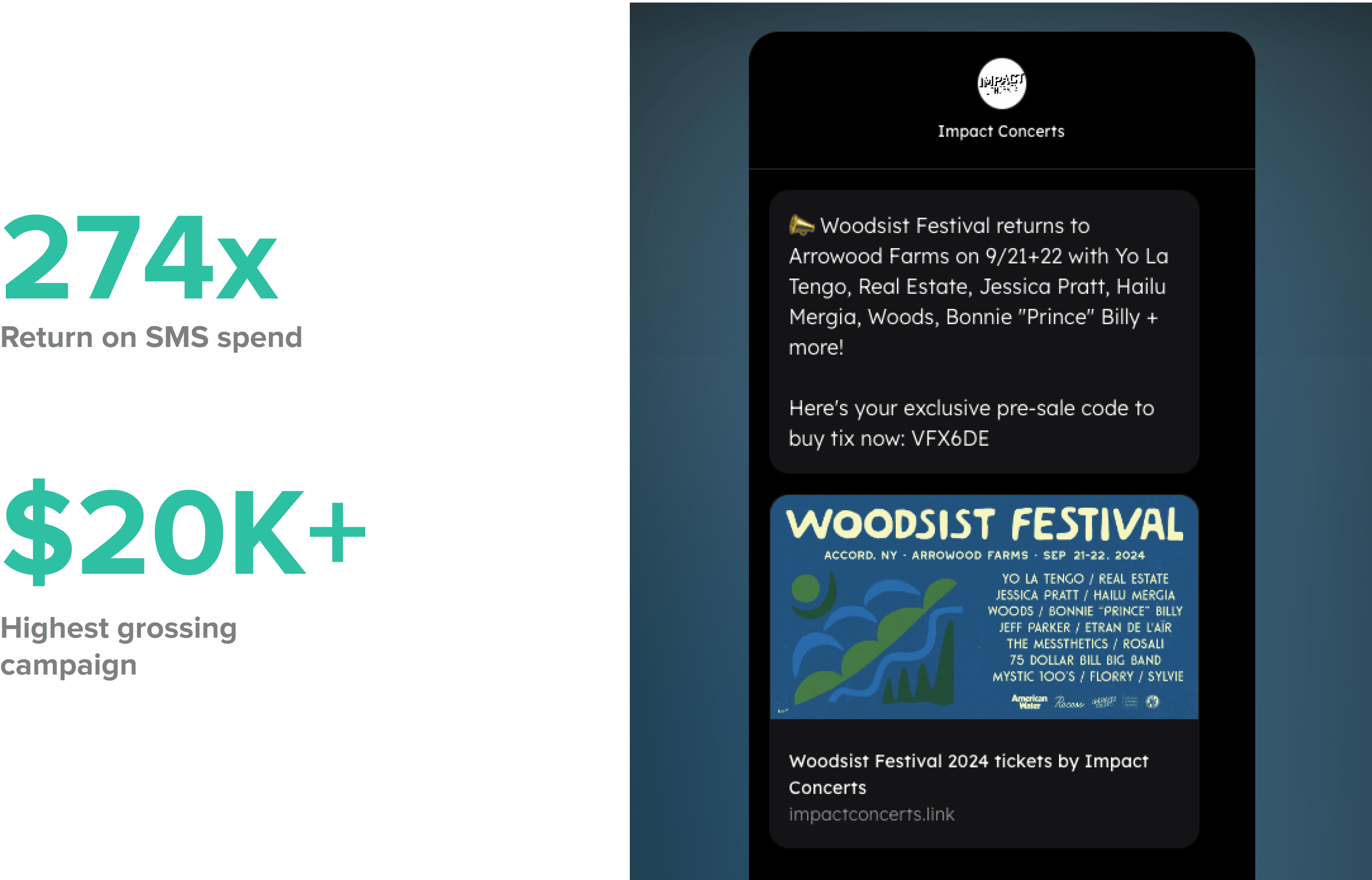 Interestingly, Impact Concerts had never tried SMS before switching to Cymbal. Since launching the program, they’ve grown their list dramatically and seen a huge boost in ticket sales.