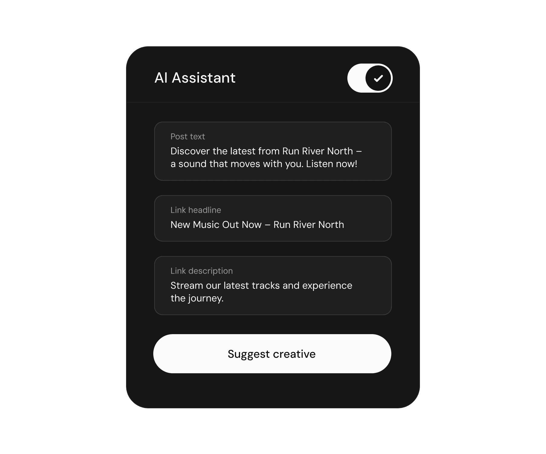 Generate and customize post text, headlines, and descriptions—fast. Use your assets or start from scratch with our AI helper.